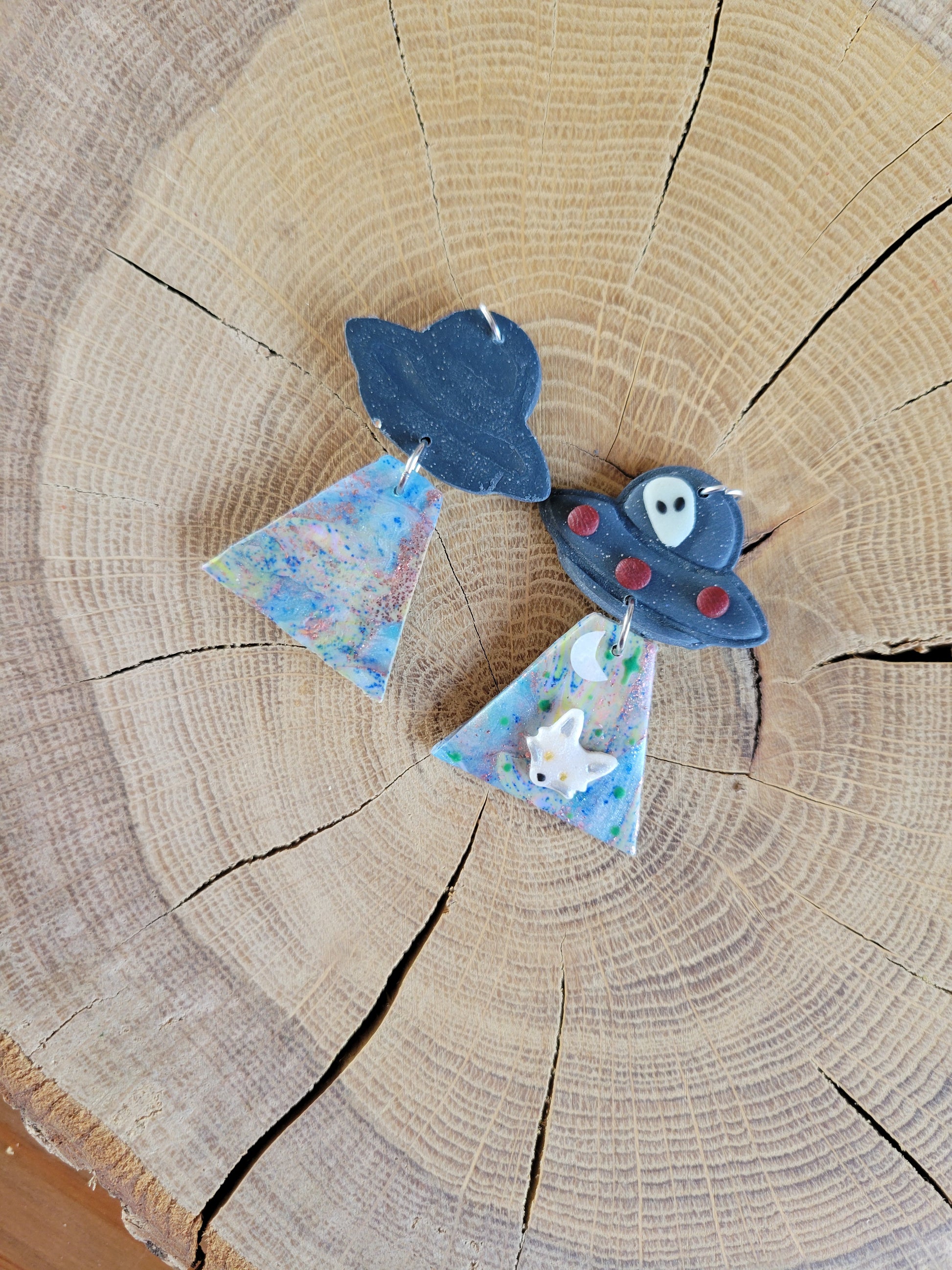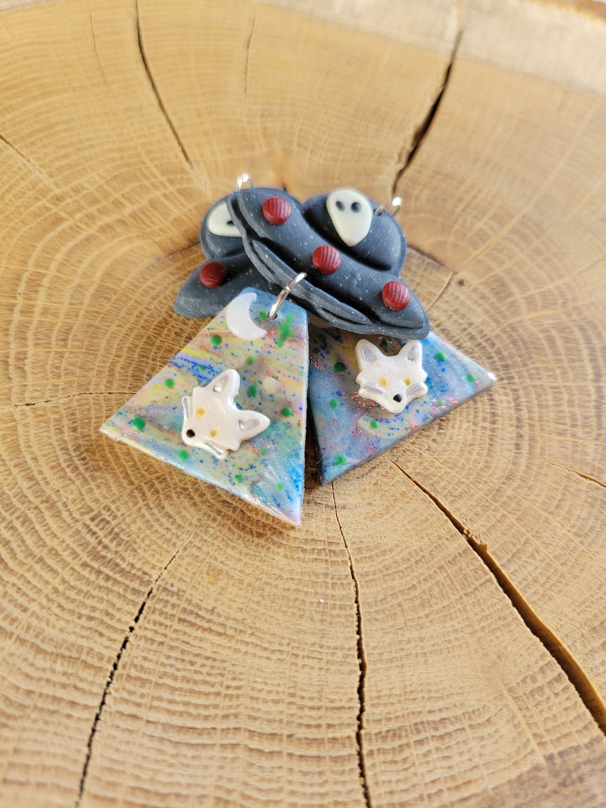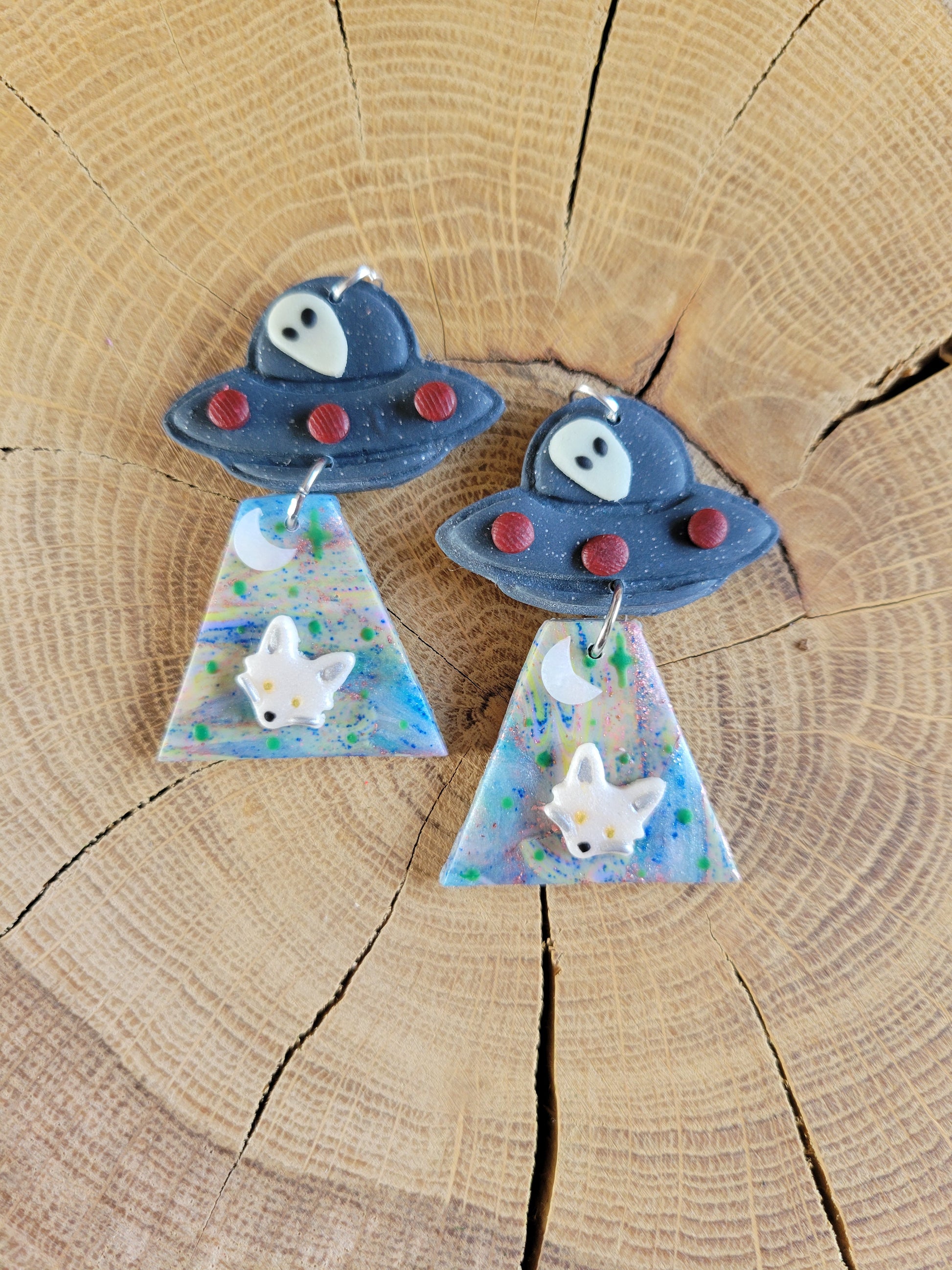 These whimsical polymer clay earrings capture a delightfully absurd moment—a curious alien whisking away an adorable arctic fox into the winter night sky. Crafted with meticulous detail, each pair features a snowy-white fox mid-abduction, complete with a glowing UFO and twinkling stars set against cool, frosty tones. Perfect for anyone who loves quirky sci-fi humour and cosy winter vibes, these lightweight earrings are a conversation starter that blends cosmic mischief with arctic charm. Wear your sense of adventure on your ears.