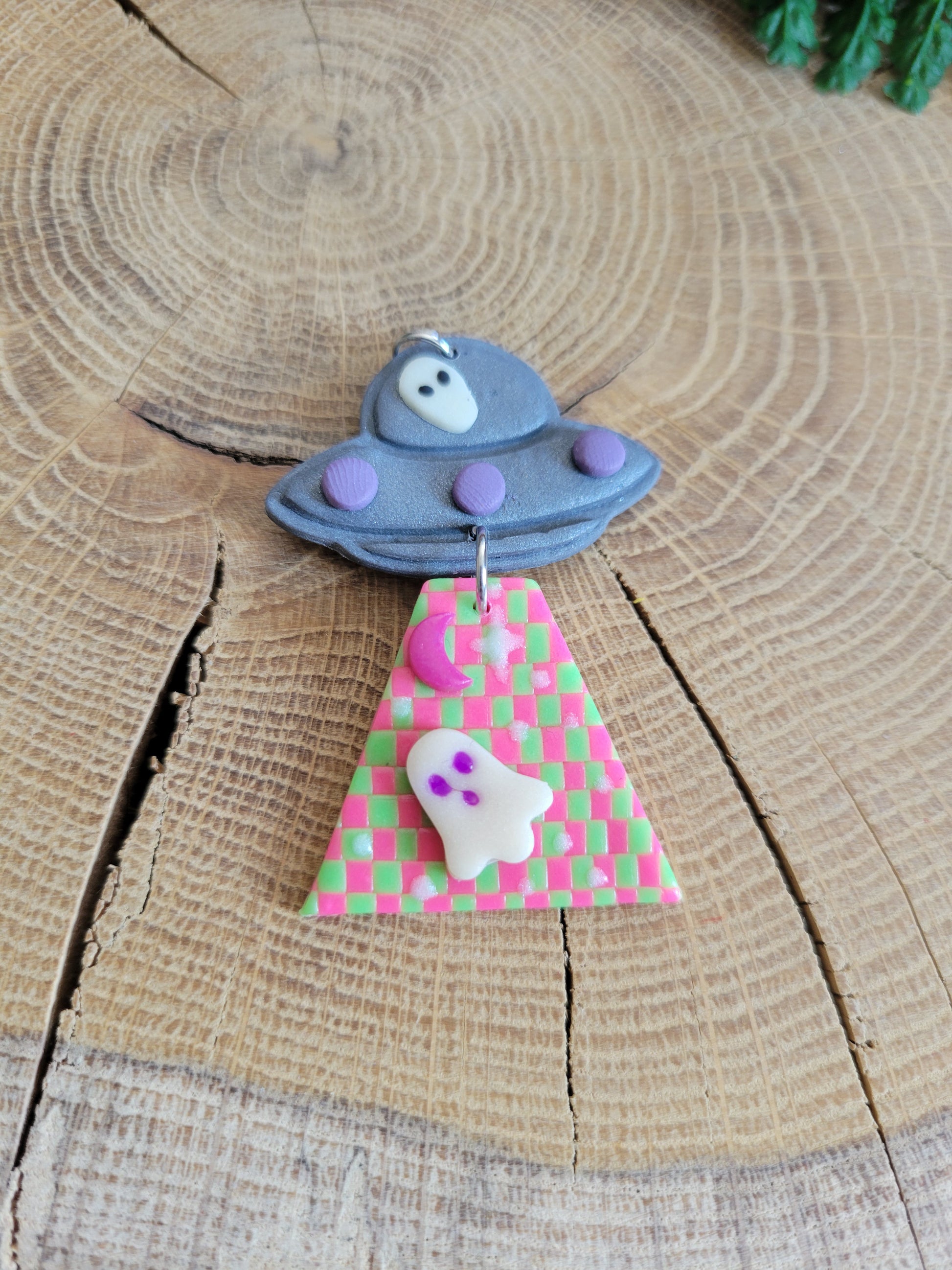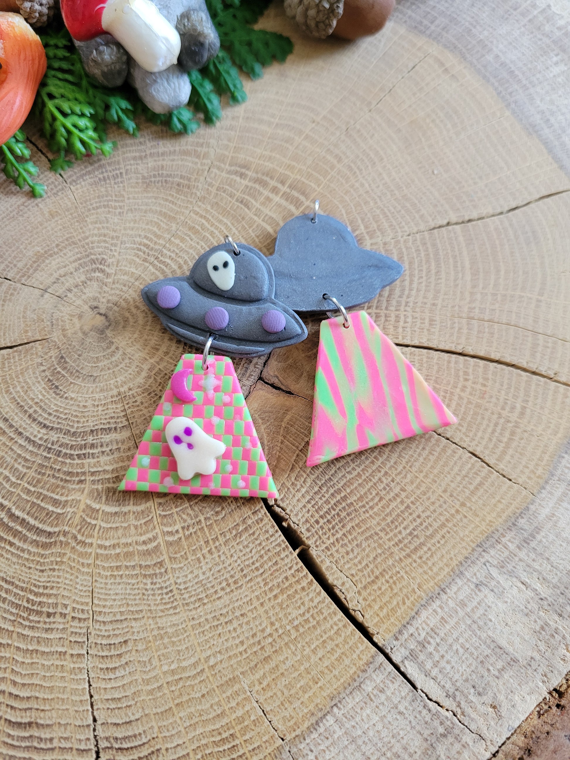 These adorable handmade polymer clay earrings bring extraterrestrial charm to your jewellery collection. Featuring a quirky checkered ghostie design that glows in the dark, they're perfect for adding a playful, otherworldly touch to any outfit. Each pair is lovingly crafted by hand, making them unique little wearables that spark conversation. Whether you're into spooky vibes or just love something fun and girly, these glow-in-the-dark beams are your new go-to accessory for standing out with style.