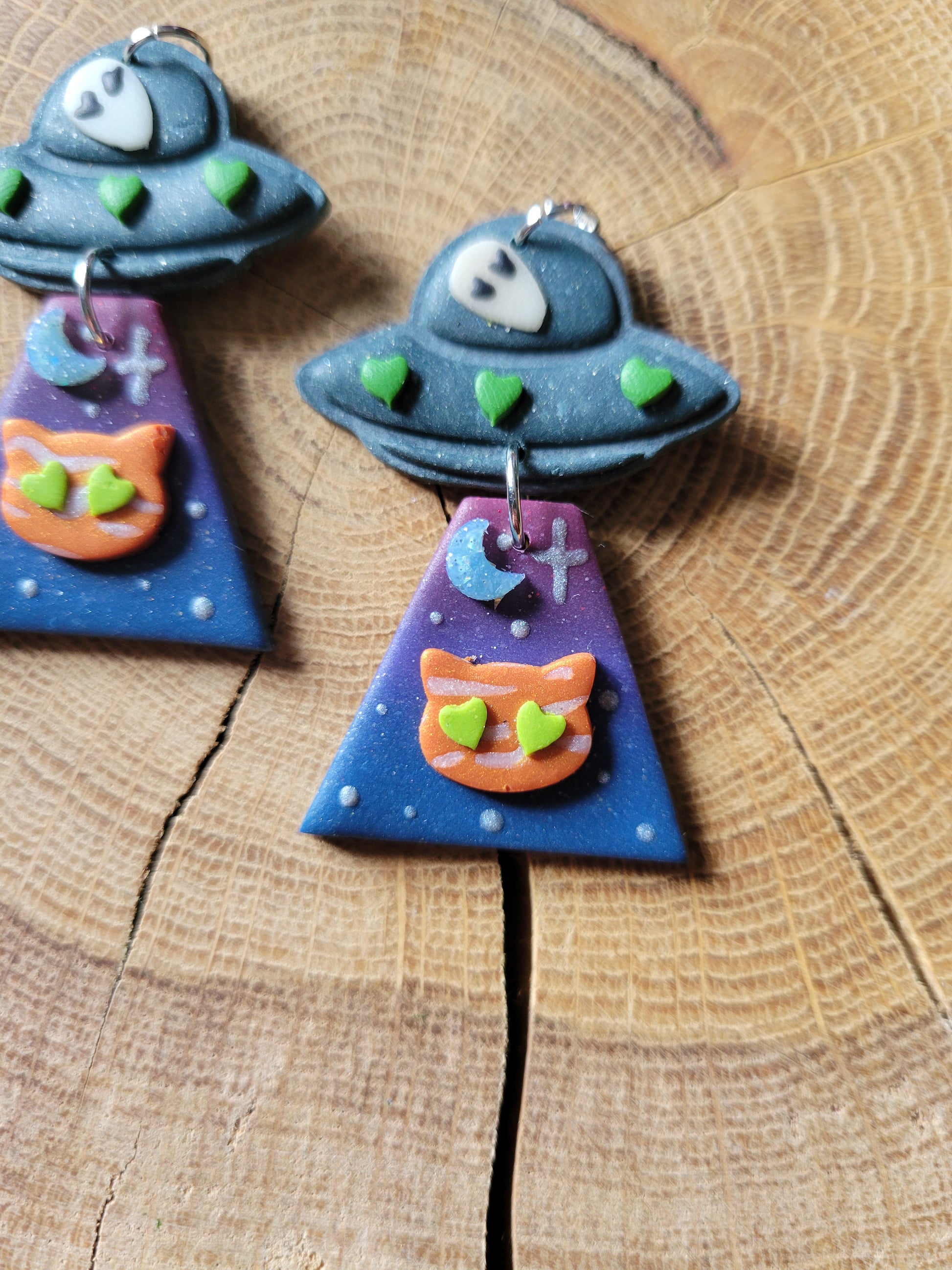 These whimsical polymer clay earrings bring extraterrestrial charm to any cat lover's collection. Handcrafted with meticulous detail, each pair features an adorable ginger cat with distinctive heart-shaped eyes that capture a dreamy, otherworldly gaze. Perfect for adding a touch of quirky personality to your everyday look or gifting to fellow feline enthusiasts. Lightweight and durable, these unique statement pieces celebrate the delightful intersection of cosmic fun and cat devotion.