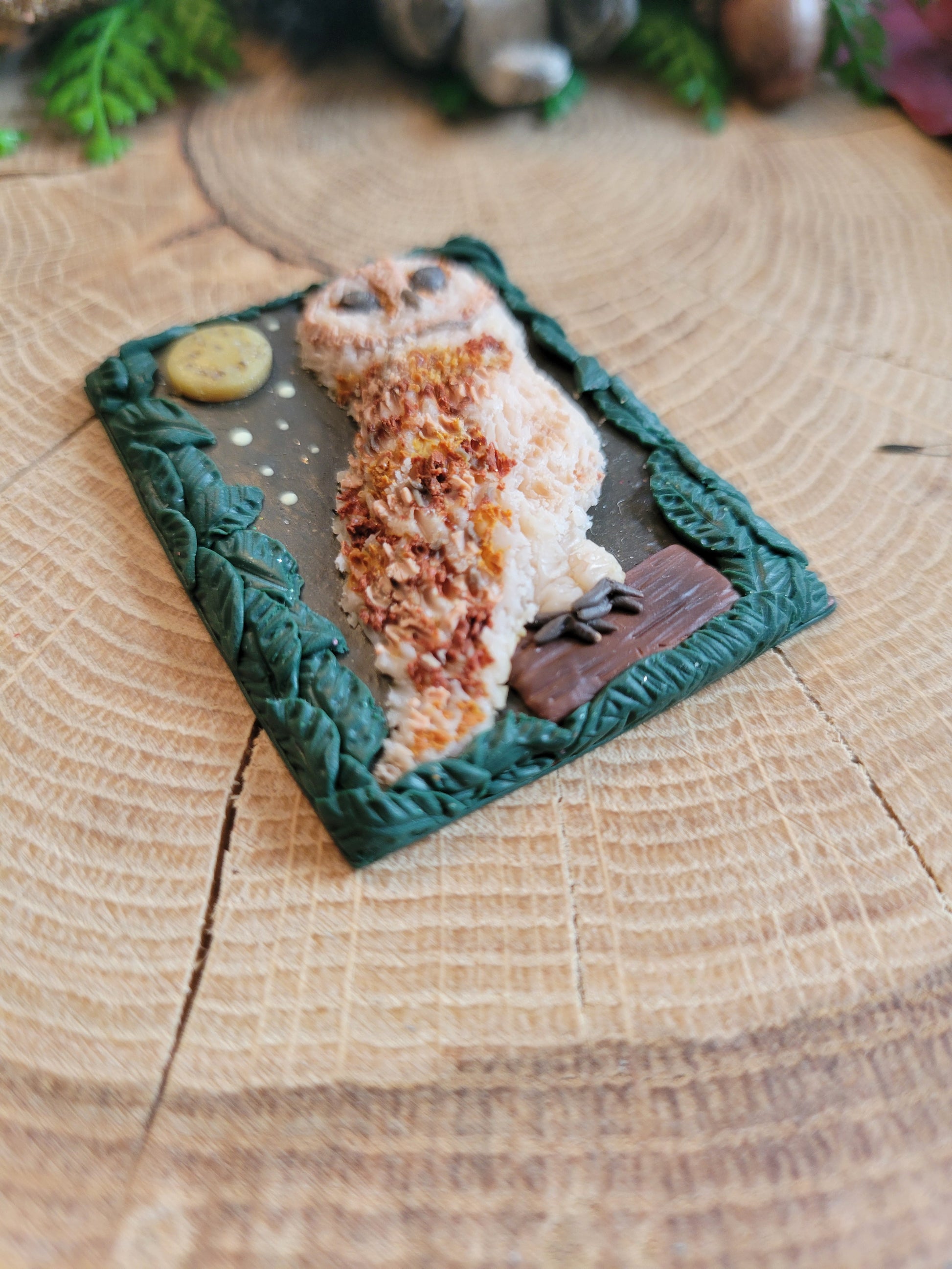 This exquisite barn owl pendant is meticulously crafted from polymer clay, showcasing intricate detailing that captures the bird's distinctive facial markings and graceful form. This piece is one-of-a-kind and individually sculpted and finished by hand, ensuring its uniqueness. The sophisticated design celebrates the barn owl's natural elegance with a leafy frame, making it a refined accessory for those who appreciate artisanal craftsmanship and wildlife-inspired jewellery.