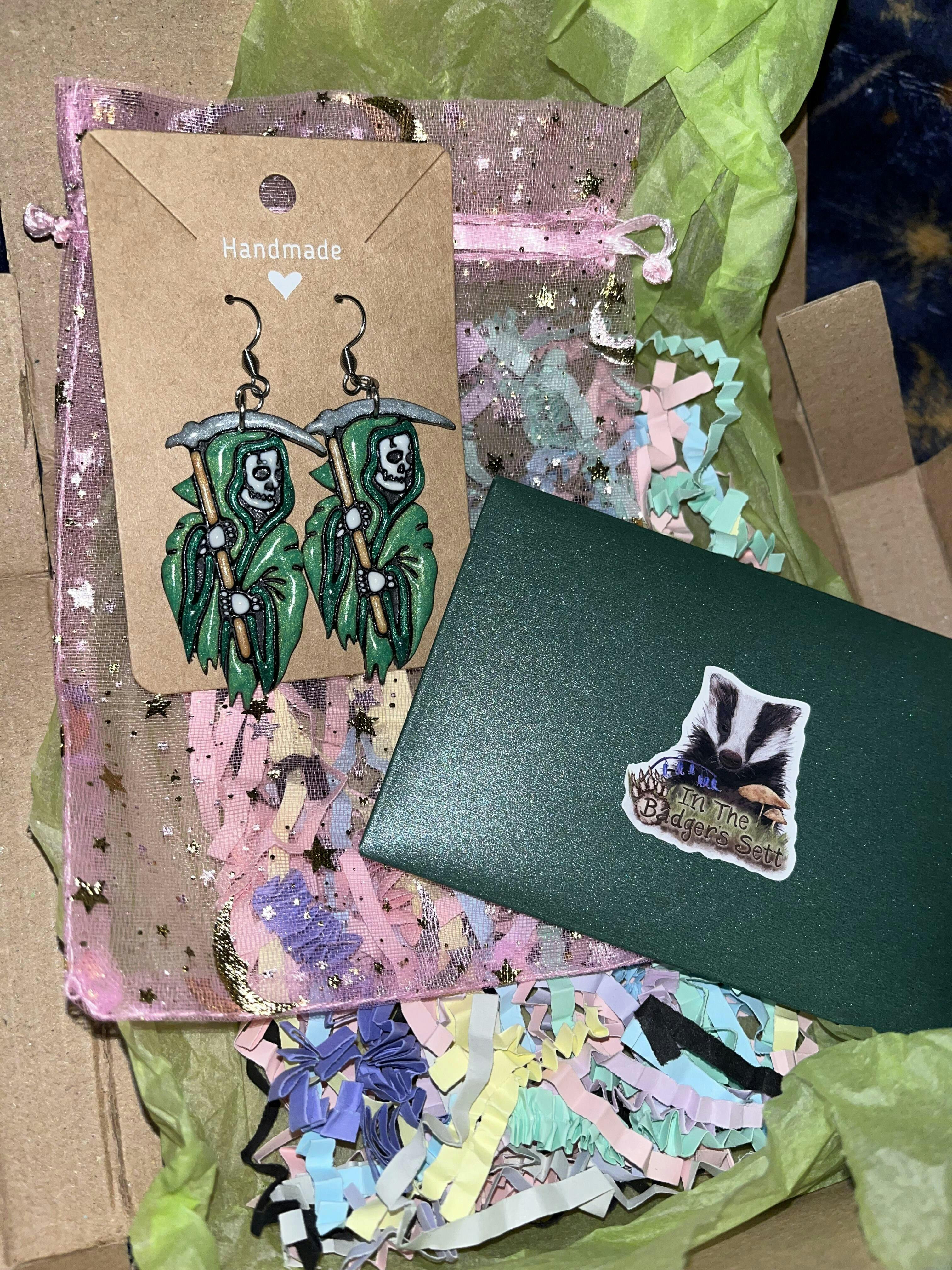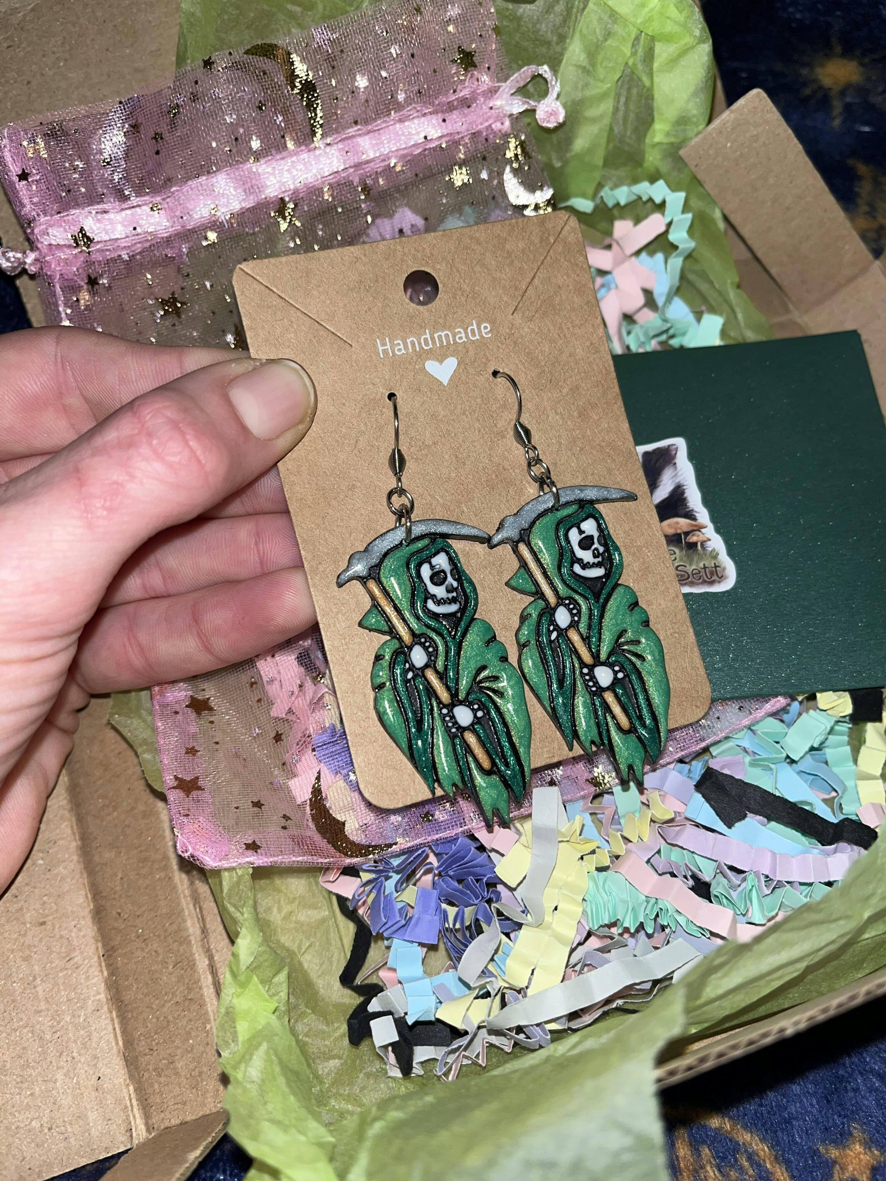 i couldn’t be happier with my order. i bought a pair of the grim reaper earrings and the quality is incredible. the attention to detail is second to none and i can’t wait to wear them. the earrings were shipped and delivered super quickly and the packaging was beautiful. i can’t recommend this business enough.