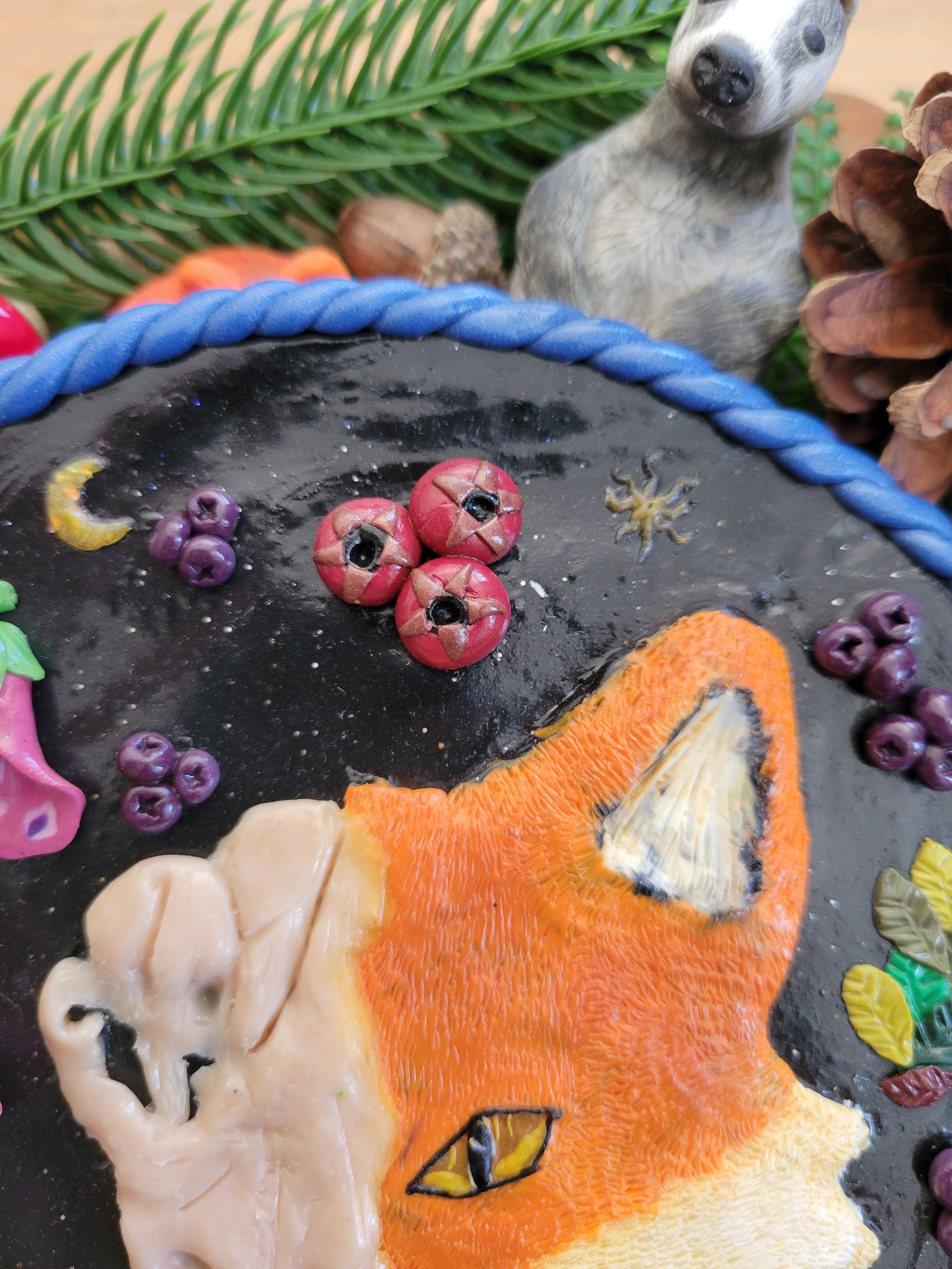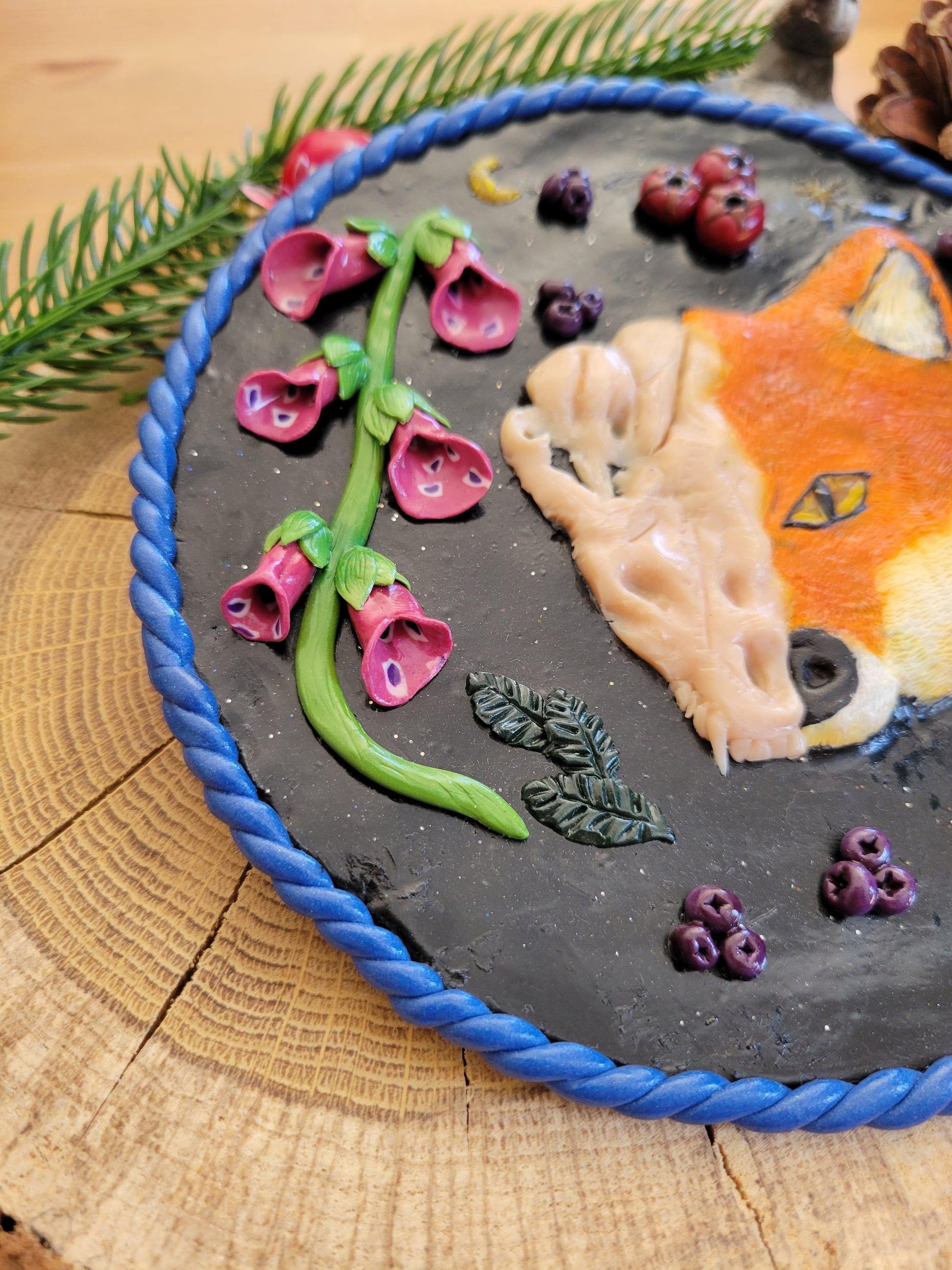 Handcrafted with meticulous attention to detail, this striking fox wall art captures the duality of nature's raw beauty. Each piece is created from scratch using polymer clay techniques, blending dark, moody aesthetics with flora/fauna elements to evoke the fox's mysterious presence in woodland shadows. A sophisticated statement for those who appreciate nature's untamed spirit and the profound symbolism of life and death cycles. Perfect for creating an atmospheric focal point in any space.