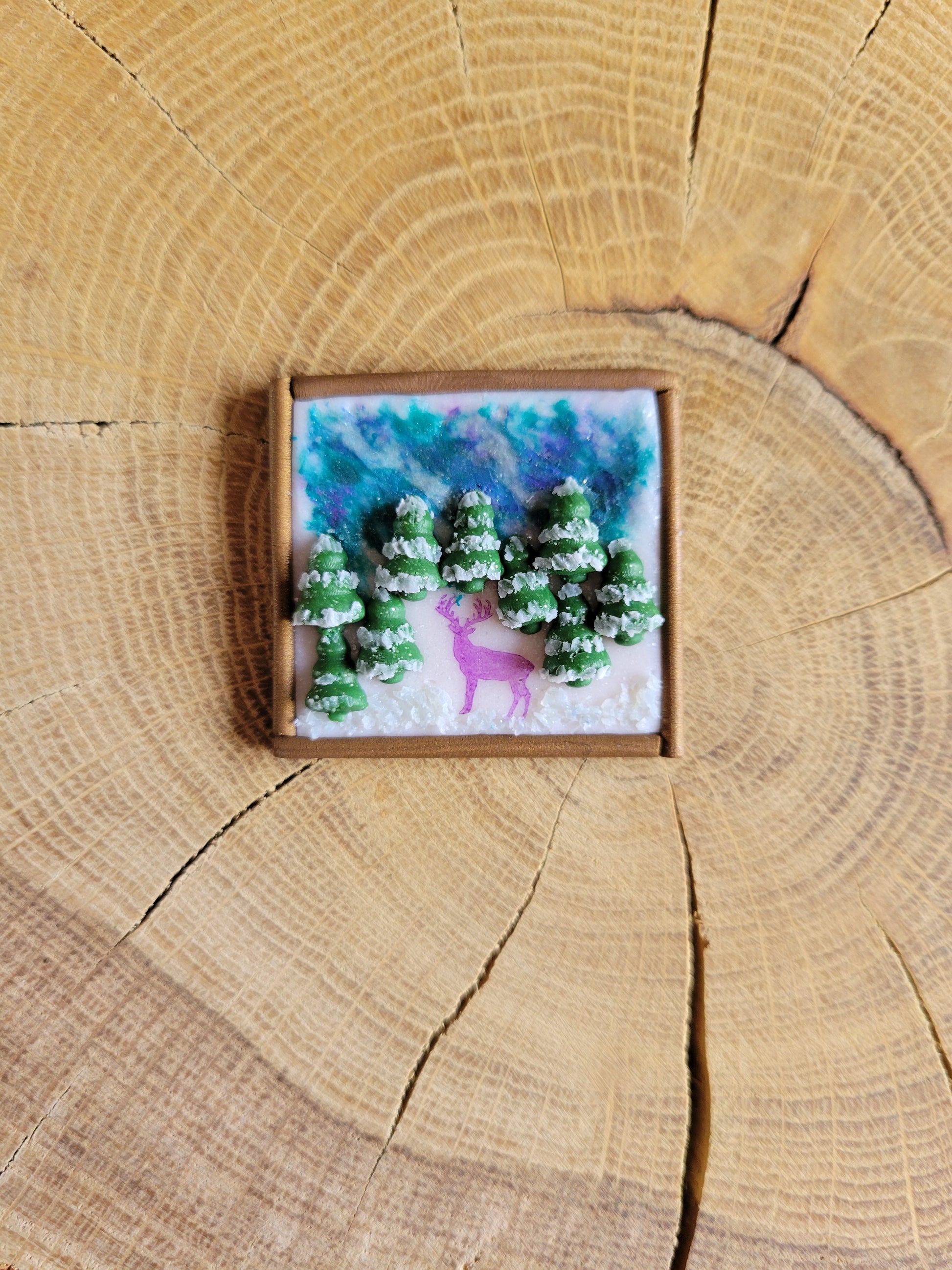 Handcrafted from polymer clay, this exquisite pendant captures the serene beauty of a winter landscape in miniature form. This piece is meticulously sculpted and finished to reveal delicate details—frosted trees, snow-covered floors, and a stunning colourful sky. The sophisticated design makes it an elegant statement piece for those who appreciate artisanal jewellery and nature-inspired aesthetics. Perfect for layering or wearing alone, this pendant brings a touch of winter-y charm to any collection.